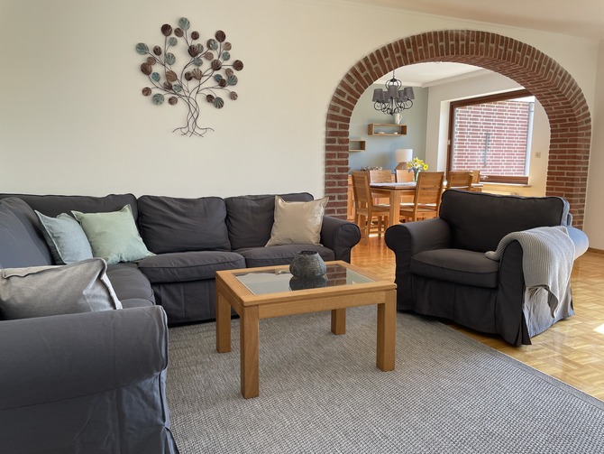 Im Erdgeschoss befindet sich ein großer gemütlicher Wohnbereich mit Sofaecke und Flat-TV, sowie der Essbereich mit ausreichend Platz für 6 Personen.